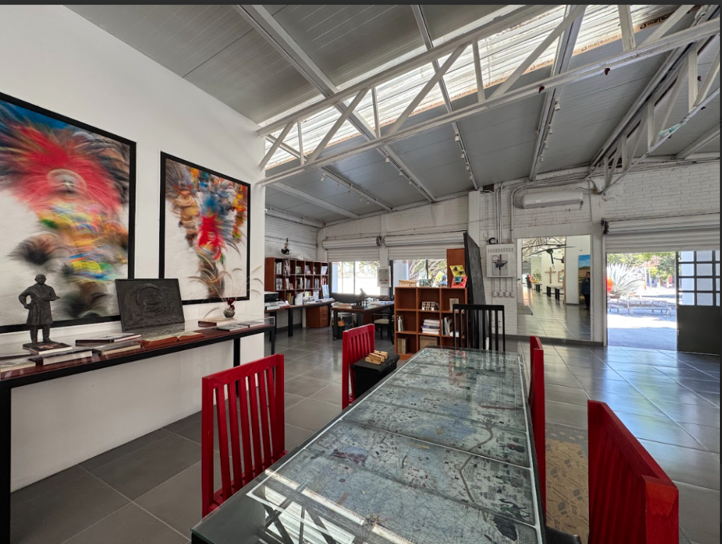 Optional access is available to the common areas across the patio, which include outdoor seating and an industrial-style meeting and conference room located inside an art gallery. This space is suitable for client meetings, presentations, or small team sessions.